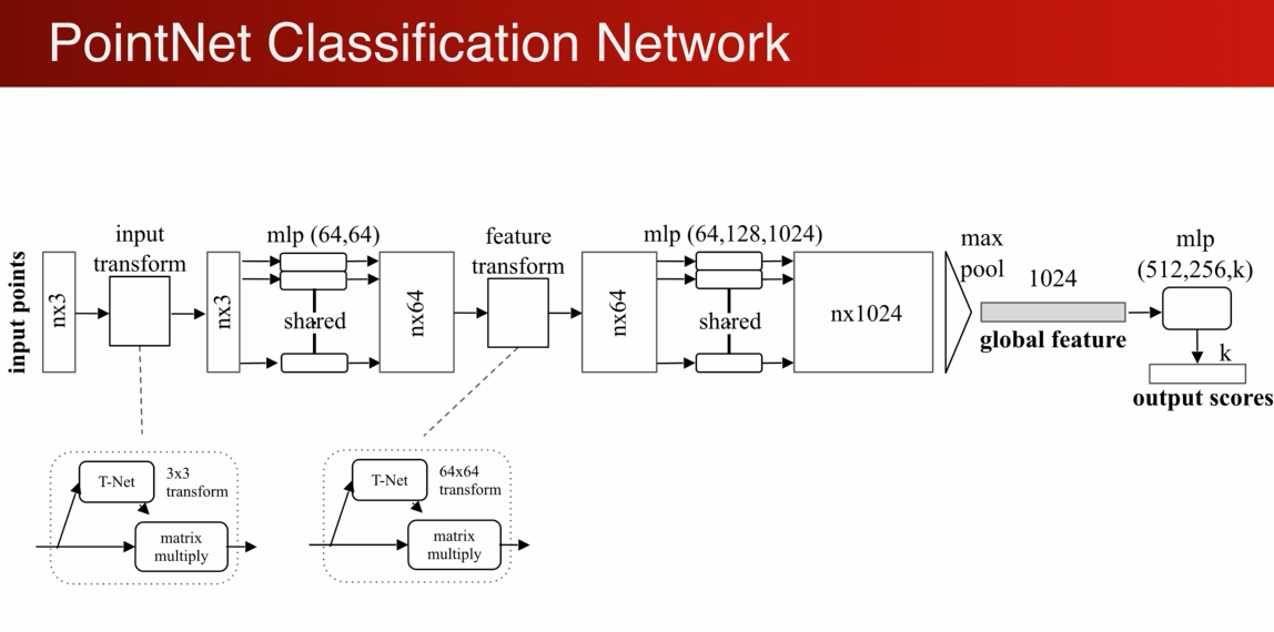 首先输入一个n*3的矩阵,先做一个输入的矩阵变换,T-net 变成一个3*3的矩阵,然后通过mlp把每个点投射到64高维空间,在做一个高维空间的变换,形成一个更加归一化的64维矩阵,继续做MLP将64维映射到1024维,在1024中可以做对称性的操作,就是maxpooling,得到globle fearue,1024维度 ,通过级联的全连接网络生成k (分类)