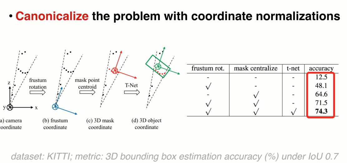 d:可以通过一个网络,去估计物体真实的中心,分割和物体中心可能不一样,在最后绿色坐标系进行bb估计