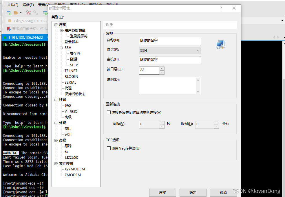 2.点击Xshell新建,填名称(自定义),主机(实例的公网IP地址)