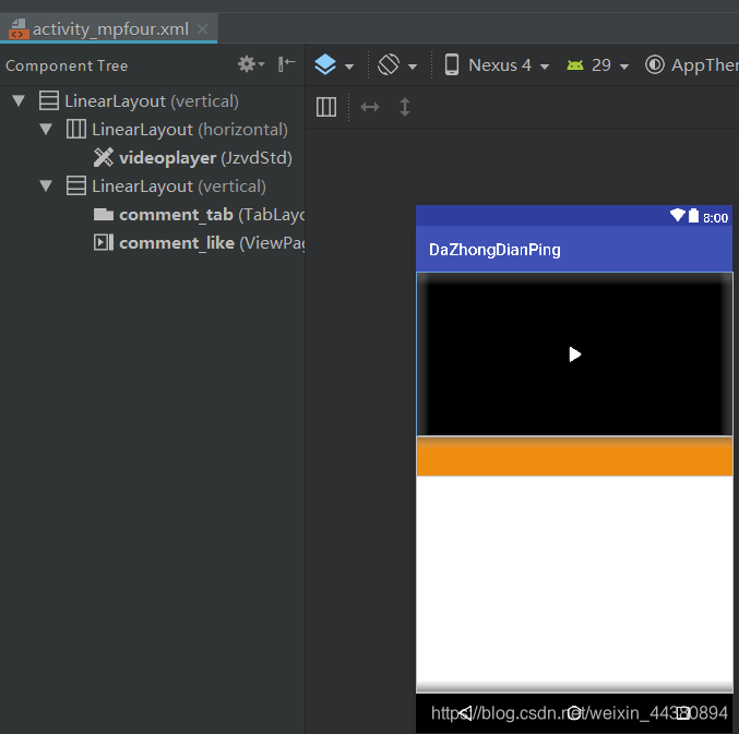 public class MPFOURActivity extends AppCompatActivity {private JzvdStd jzvdStd;Jzvd.JZAutoFullscreenListener fullscreenListener;SensorManager mSensorManager;private ViewPager mViewPager;private TabLayout mTabLayout;private MyMedFragmentAdapter medFragmentAdapter;@Overrideprotected void onCreate(Bundle savedInstanceState) {super.onCreate(savedInstanceState);setContentView(R.layout.activity_mpfour);initView();setVideo();setListener();}private void initView(){getSupportActionBar().setDisplayHomeAsUpEnabled(true);getSupportActionBar().setDisplayShowHomeEnabled(true);getSupportActionBar().setDisplayShowTitleEnabled(true);getSupportActionBar().setDisplayUseLogoEnabled(false);jzvdStd=findViewById(R.id.videoplayer);mTabLayout=findViewById(R.id.comment_tab);mViewPager=findViewById(R.id.comment_like);medFragmentAdapter=new MyMedFragmentAdapter(getSupportFragmentManager());mViewPager.setAdapter(medFragmentAdapter);mTabLayout.setupWithViewPager(mViewPager);}private void setVideo(){jzvdStd.setUp("http://jzvd.nathen.cn/c6e3dc12a1154626b3476d9bf3bd7266/6b56c5f0dc31428083757a45764763b0-5287d2089db37e62345123a1be272f8b.mp4", "饺子闭眼睛",jzvdStd.SCREEN_NORMAL/*,JzvdStd.SCREEN_STATE_ON*/);Glide.with(this).load("http://p.qpic.cn/videoyun/0/2449_43b6f696980311e59ed467f22794e792_1/640").into(jzvdStd.thumbImageView);}private void setDefinition(){/*** 给你要展示的视频准备多套清晰度的地址来调用* 自己写清晰度切换的UI*/}private void setListener(){fullscreenListener=new Jzvd.JZAutoFullscreenListener();mSensorManager= (SensorManager) getSystemService(SENSOR_SERVICE);}@Overridepublic void onBackPressed() {if(Jzvd.backPress()){return;}super.onBackPressed();}@Overridepublic boolean onOptionsItemSelected(MenuItem item) {switch (item.getItemId()) {case android.R.id.home:finish();break;}return super.onOptionsItemSelected(item);}@Overrideprotected void onPause() {super.onPause();mSensorManager.unregisterListener(fullscreenListener);Jzvd.clearSavedProgress(this, null);Jzvd.goOnPlayOnPause();}@Overrideprotected void onResume() {super.onResume();Sensor accelerometerSensor = mSensorManager.getDefaultSensor(Sensor.TYPE_ACCELEROMETER);mSensorManager.registerListener(fullscreenListener, accelerometerSensor, SensorManager.SENSOR_DELAY_NORMAL);Jzvd.goOnPlayOnResume();}