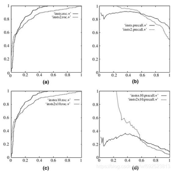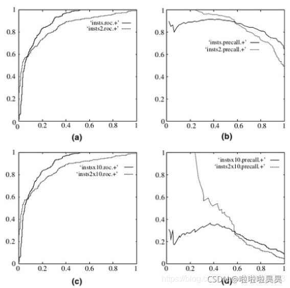a,b 为在原始测试集(balanced)上的结果,c,d为把原始数据集的负样本增加10倍后的结果。很明显,ROC曲线基本保持不变,P-R曲线变化较大。
