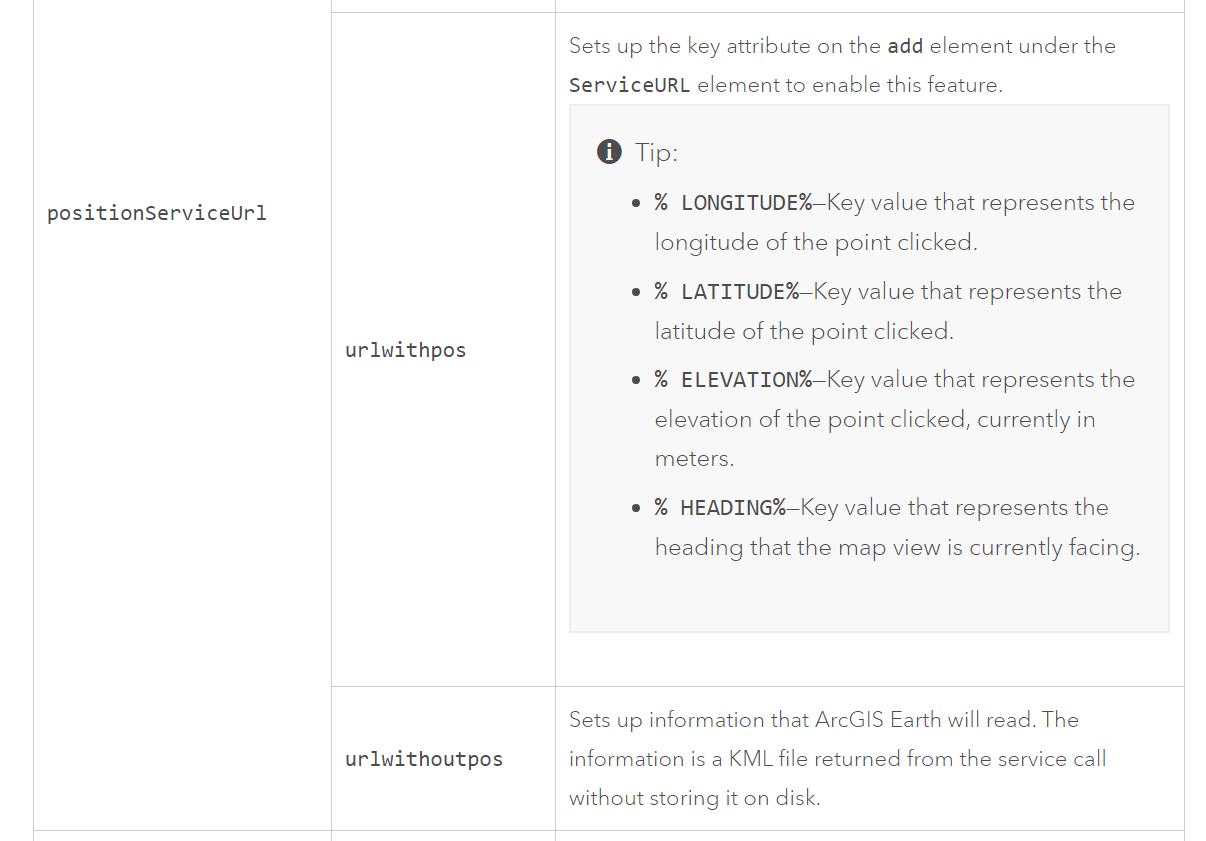 计算机管理员可以输入某些带有编码值的URL, 这些编码值会被ArcGIS Earth识别,并填充相应的位置信息。 在设置好该参数后,用户在ArcGIS Earth中使用鼠标右键单击地面,将会把点击的点的经纬度,高程等信息传递到该URL,并向管理员配置的服务器发送请求,当服务器返回有效的KML时,该KML将会显示在地球窗口中。
