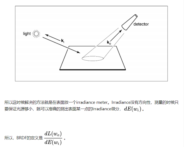 考虑某一面积dA,从某一 立体角接受到的Irradiance,会如何被分配到各个不同的立体角上去,这个就是BRDF。