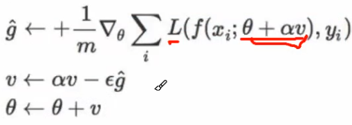 m是每个mini batch的样本数量。θ是权重,L是损失函数。v是动量。当前拍动量的继承了上一次的动量(乘以权重α),再与梯度加和。然后θ根据动量进行调整。