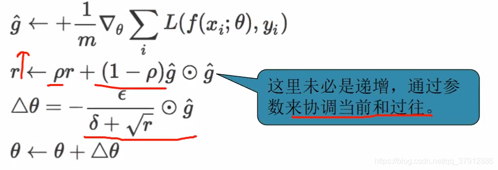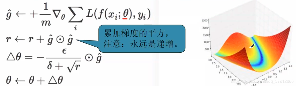 为调整后的学习步长。注意:学习步长的总原则,学习随着轮次增加,步长越来越小。前式r的累加使得分母越来越大。但是这个累加的存在导致步长只能越来越小学习速度放慢,过早结束。这也是Adagrad存在的问题。