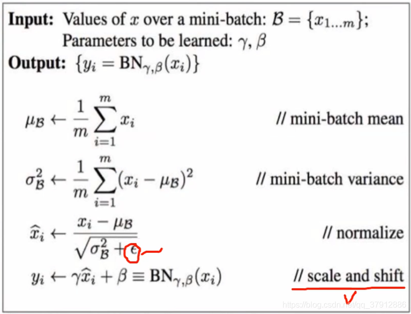 在每次SGD( 随机梯度下降)时,通过mini-batch来对相应的activation做规范化操作,使得结果(输出信号个维度)的均值为0,方差为1。剪掉均值,除以方差。不只是输入,而且层与层之间也可能会有Normalization。 最后的“scaleand shift”操作则是为了让因训练所需而“刻意”加入的BN能够有可能还原最初的输入。