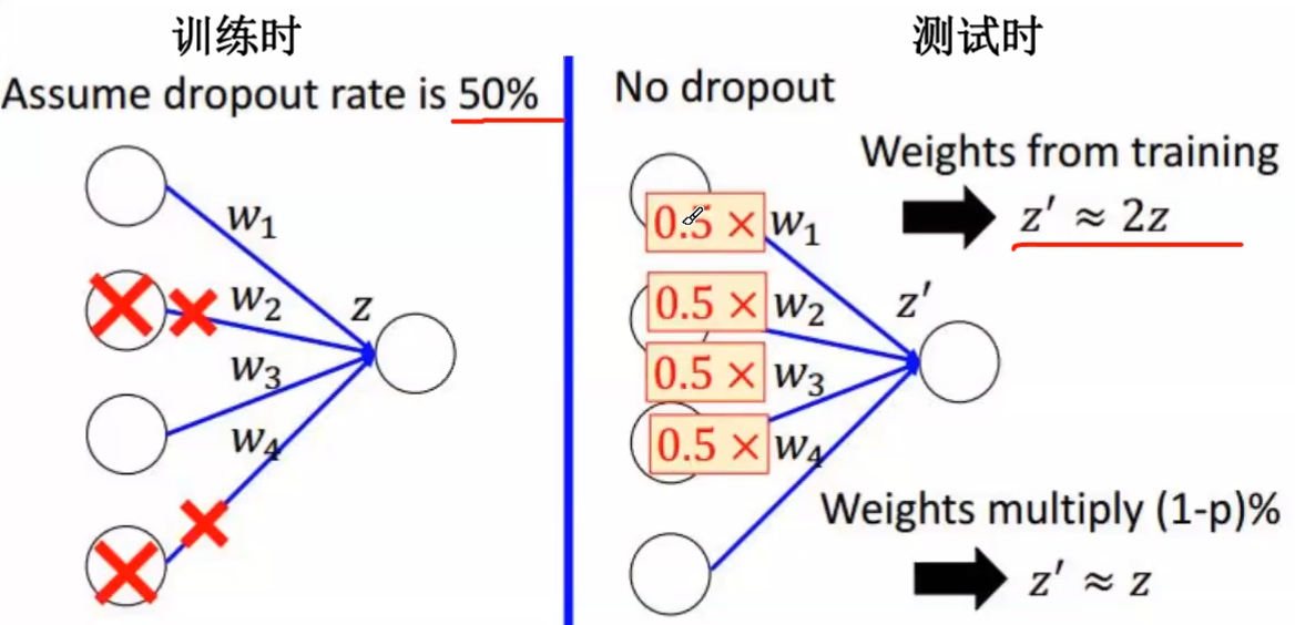 测试时权重应减小:测试时,使用所有的神经元,且权重应根据删减比例缩小。
