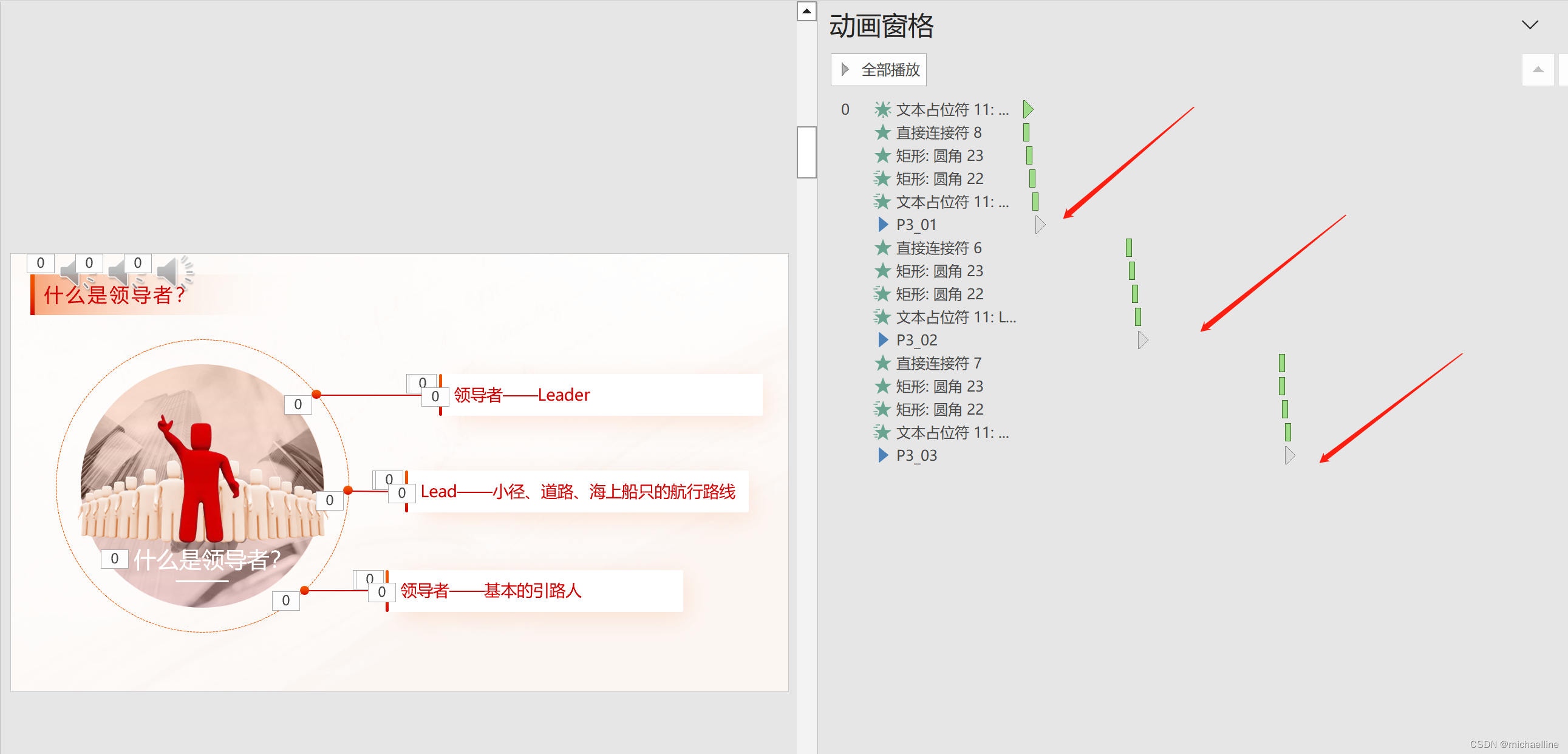 生成的基本原理及结果如下图举例,根据每页的语音讲解词,并根据动画指令的条数生成对应的语音条数,并根据动画时间轴进行计算和插入。