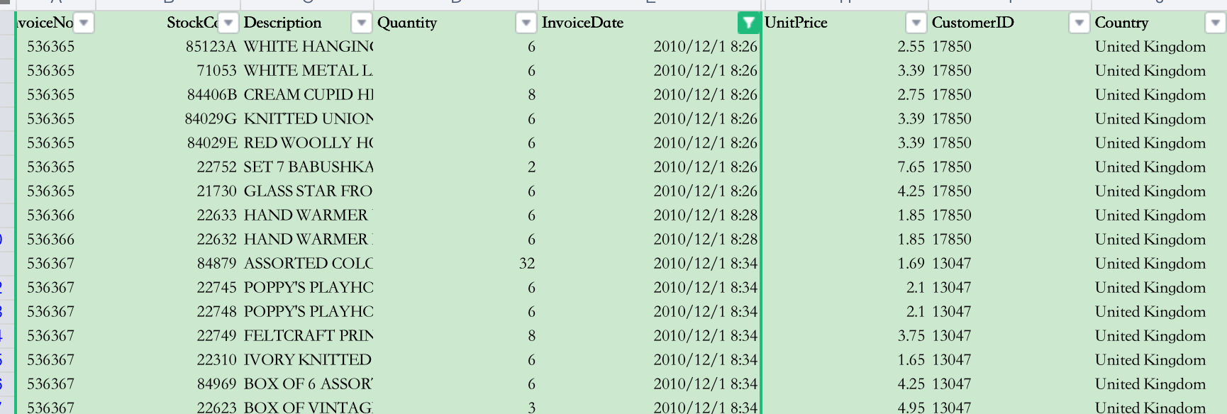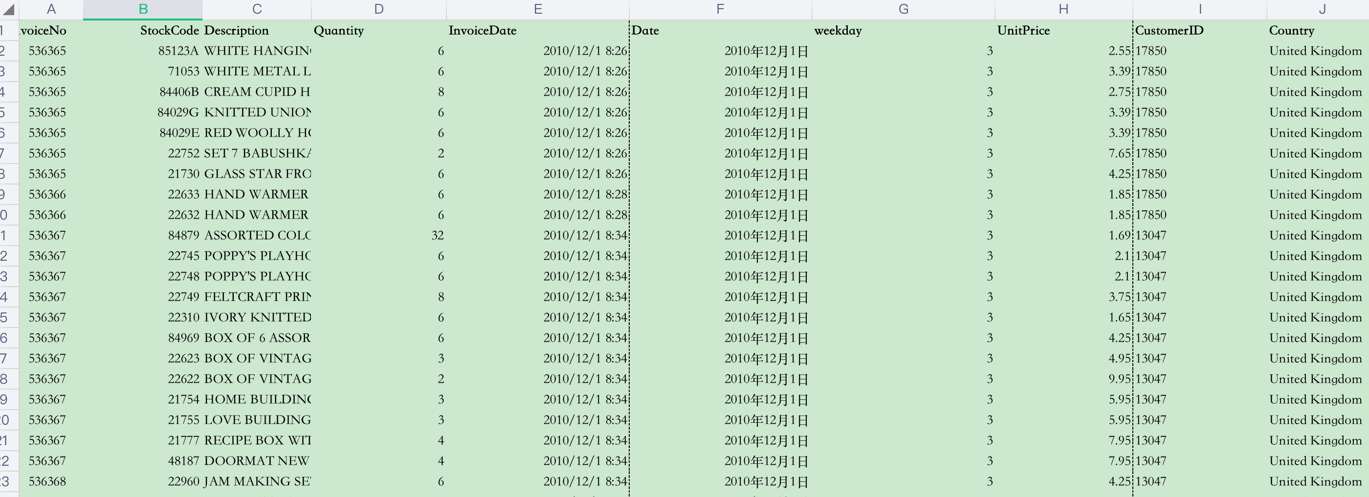 2)对下载好的原始数据在Excel中打开,删除costomer ID的空行、unitprice值位0的行和quantity为负值的行。