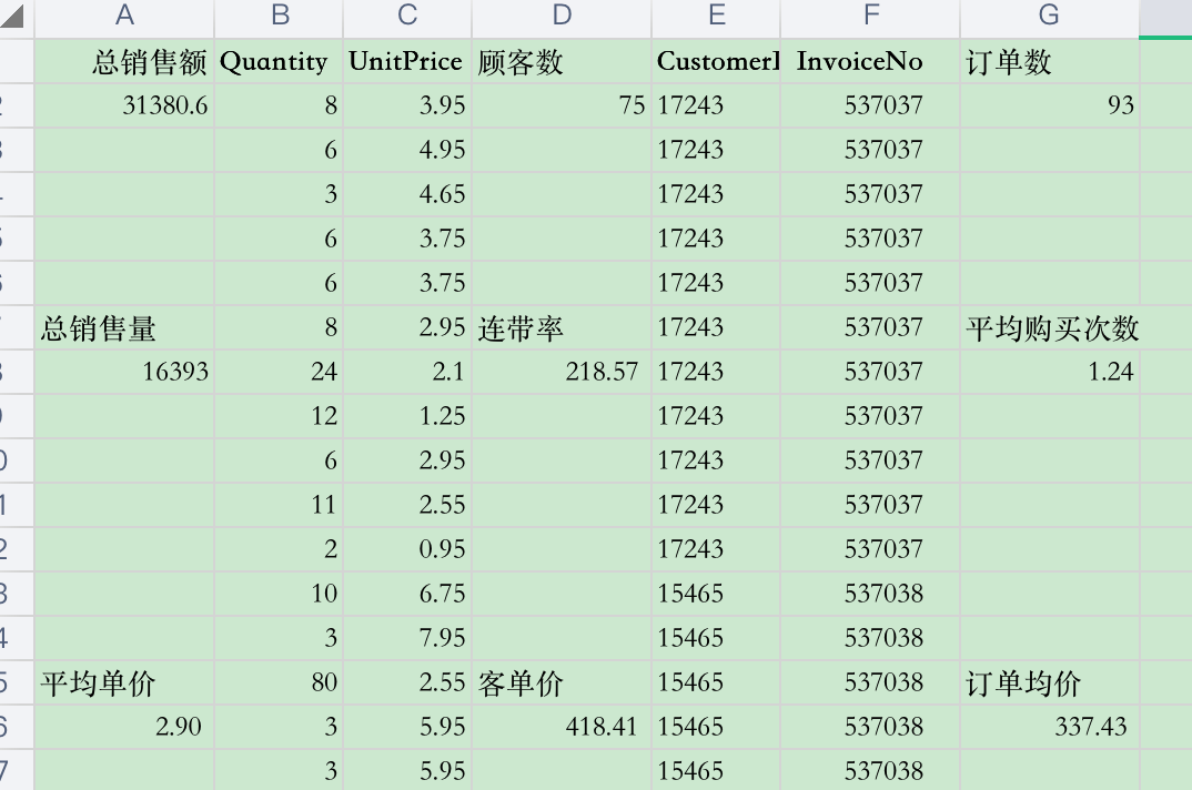 - 计算平均购买次数=订单数/顾客数;订单均价=销售额/订单数;件单价=销售额/销售量。