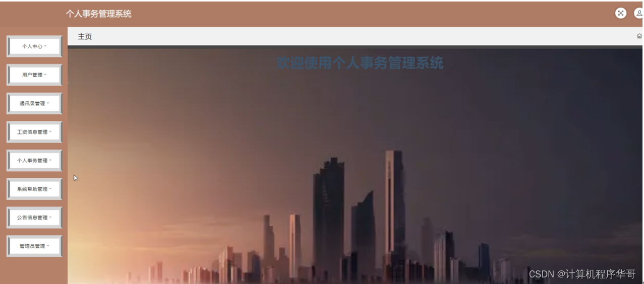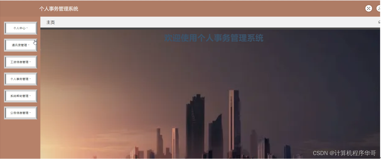 用户登录进入个人事务管理系统可以对主页,个人中心,通讯录管理,工资信息管理,个人事务管理,系统帮助管理,公告信息管理等进行相应操作,如图5-9所示。