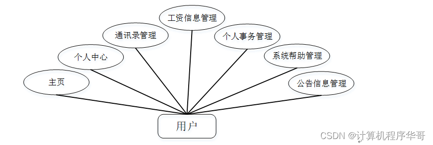 (b) 用户;用户使用本系统涉到的功能主要有:主页,个人中心,通讯录管理,工资信息管理,个人事务管理,系统帮助管理,公告信息管理等功能。用户用例图如图3-2所示。