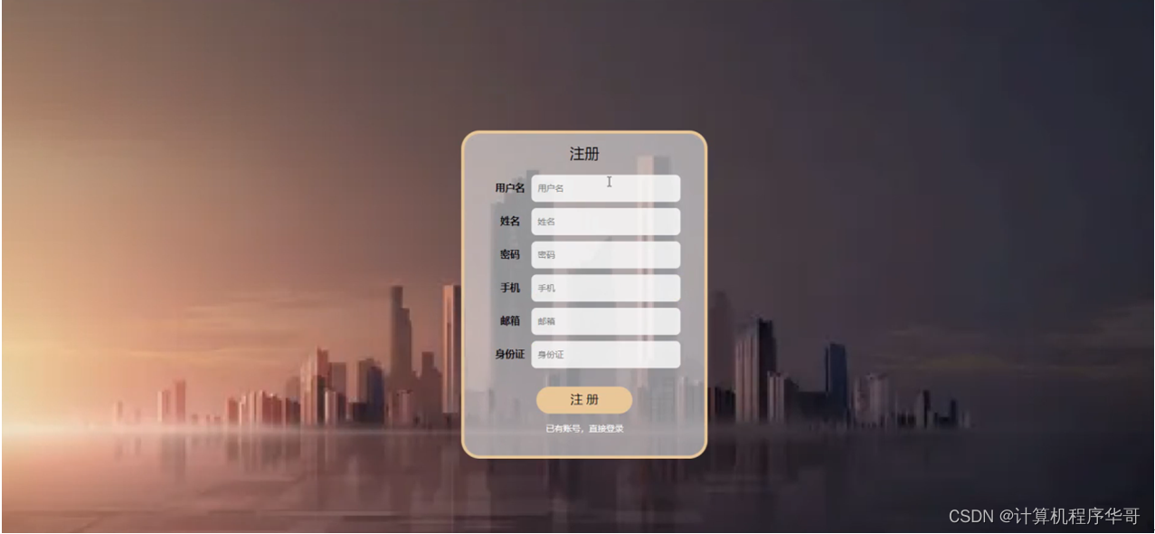 用户注册;在注册页面通过填写用户名,姓名,密码,手机,邮箱,身份证等内容进行注册操作,如图5-8所示。