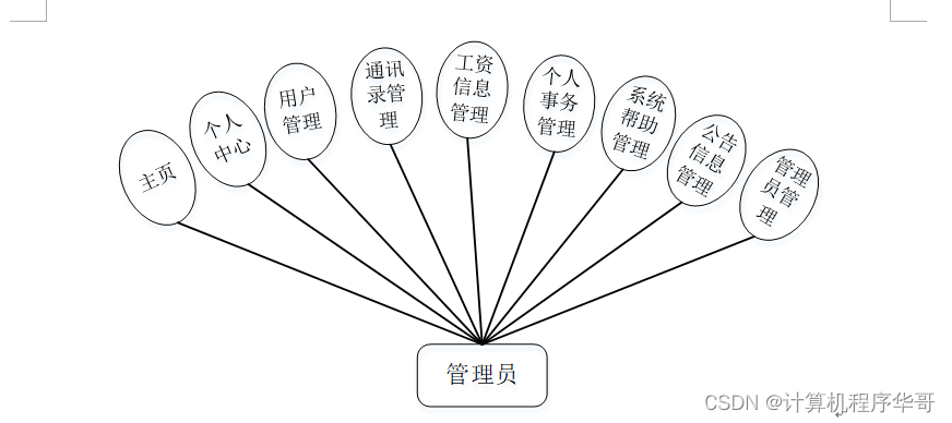 (a) 管理员;管理员使用本系统涉到的功能主要有:主页,个人中心,用户管理,通讯录管理,工资信息管理,个人事务管理,系统帮助管理,公告信息管理,管理员管理等功能。管理员用例图如图3-1所示。