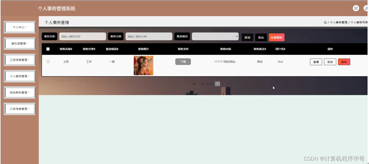 个人事务管理;在个人事务管理页面可以对事务名称,事务分类,紧急情况,事务图片,事务文件,事务内容,事务备注,用户名等内容进行查看,修改和删除等操作,如图5-13所示。