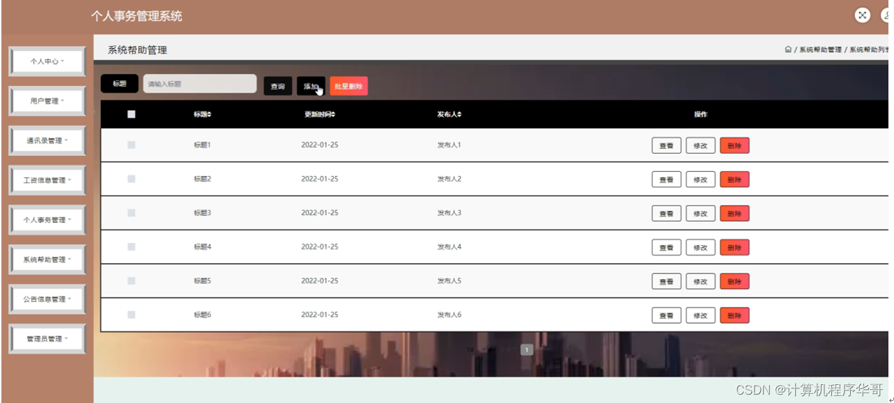 系统帮助管理;在系统帮助管理页面可以对标题,更新时间,发布人等内容进行查看,修改和删除等操作,如图5-6所示。