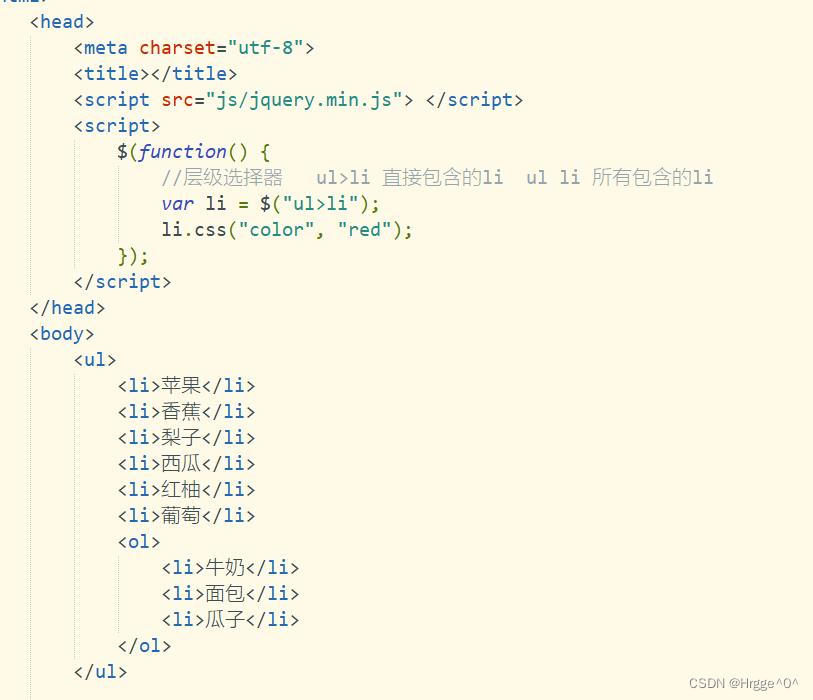 | 子代选择器 | $("ul>li") | 使用>号,获取亲儿子层级的元素;注意:并不会获取子孙层级的元素 |