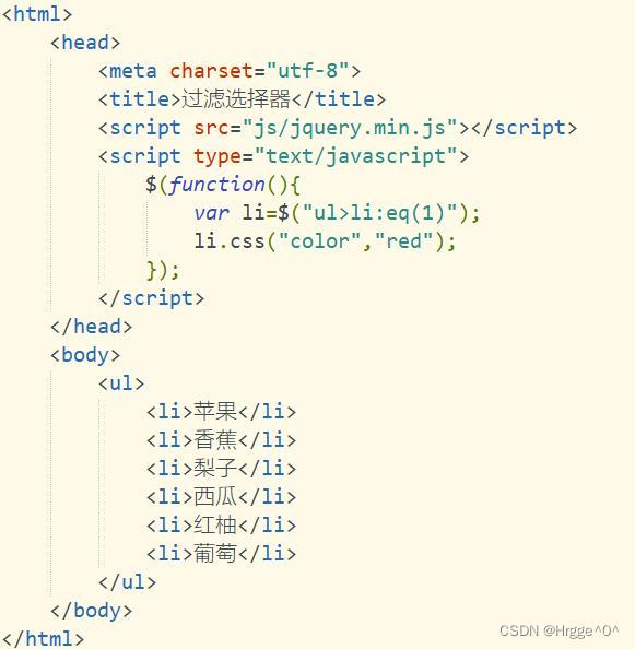 | :eq(index) | $("li:eq(2)") | 获取到的li元素中,选择索引号为2的元素,索引号index从0开始 |