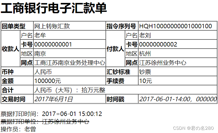 回单类型 网上转账汇款 指令序列号 HQH10000000001000100 收款人 户名 老牟 付款人 户名 老刘 卡号 00000000001 卡号 00000000002 地区 南京 地区 杭州 网点 工商江苏南京业务处理中心 网点 江苏徐州业务中心 币种 人民币 汇钞标准 钞票 金额 100000元 手续费 10元 合计 人民币(大写):拾万元整 交易时间 2017年6月1日 时间戳 2017-06-01-14:00,000000