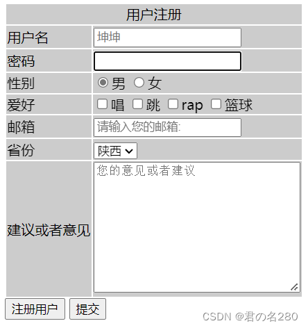 用户注册 用户名 密码 性别 男女 爱好 唱跳rap篮球 邮箱 省份 建议或者意见