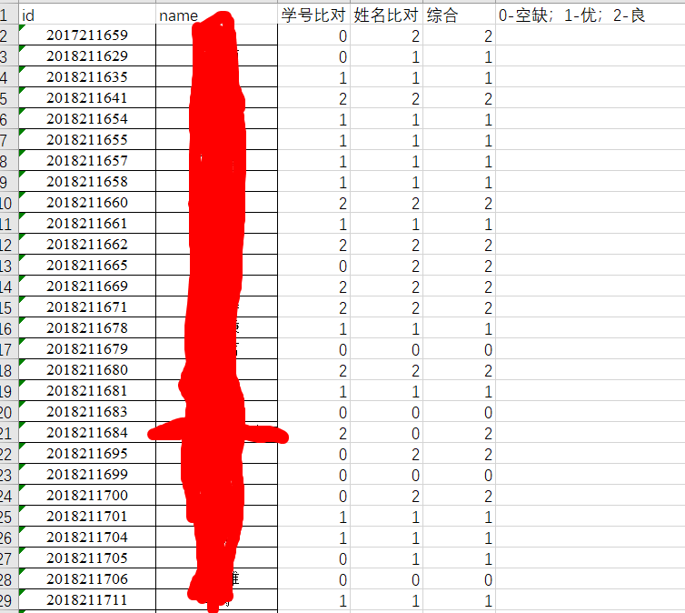 def excel_deal(you,liang):# 打开文件data = xlrd.open_workbook('names.xlsx')# 查看工作表data.sheet_names()print("sheets:" + str(data.sheet_names()))# 通过文件名获得工作表,获取工作表1table = data.sheet_by_name('Sheet1')# 获取行数和列数 行数:table.nrows 列数:table.ncolsprint("总行数:" + str(table.nrows))print("总列数:" + str(table.ncols))out_list = []for rowNum in range(table.nrows):if rowNum > 0:rowVale = table.row_values(rowNum)id_str = rowVale[0]name_str = rowVale[1]value0 = 0value1 = 0value2 = 0#按照学号查找if you.find(id_str) > 0:value0 = 1if liang.find(id_str) > 0:value0 = 2#按照 姓名查找if you.find(name_str) > 0:value1 = 1if liang.find(name_str) > 0:value1 = 2#综合if value0 == 0 and value1 == 0:value2 = 0else:if value0 > 0 and value1 > 0 and value0 != value1:print('-Error--'+name_str)value2 = max(value0, value1)value_str = str(value0)+','+str(value1)+','+str(value2)# print(value_str)out_list.append([rowVale[0],rowVale[1],value0,value1,value2])print(out_list)name = ['学号', '姓名', '学号比对', '姓名比对', '综合']out_data = pd.DataFrame(columns=name, data=out_list)print(out_data)out_data.to_csv('./result.csv', encoding='gbk')out_data.to_excel('./result.xlsx', encoding='gbk')#print(str(rowNum)+','+name_str+','+str(value)+'\n')if __name__ == '__main__':you_data = get_file_names('./you/')you_str = ''.join(you_data)print(len(you_data))print(you_str)liang_data = get_file_names('./liang/')liang_str = ''.join(liang_data)print(len(liang_data))print(liang_str)excel_deal(you_str,liang_str)