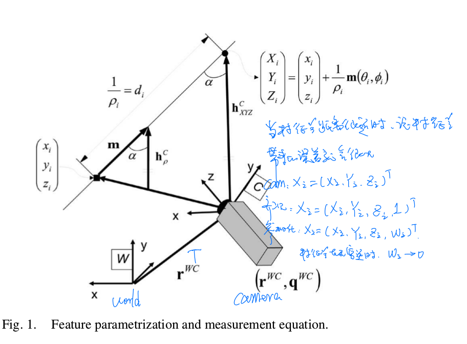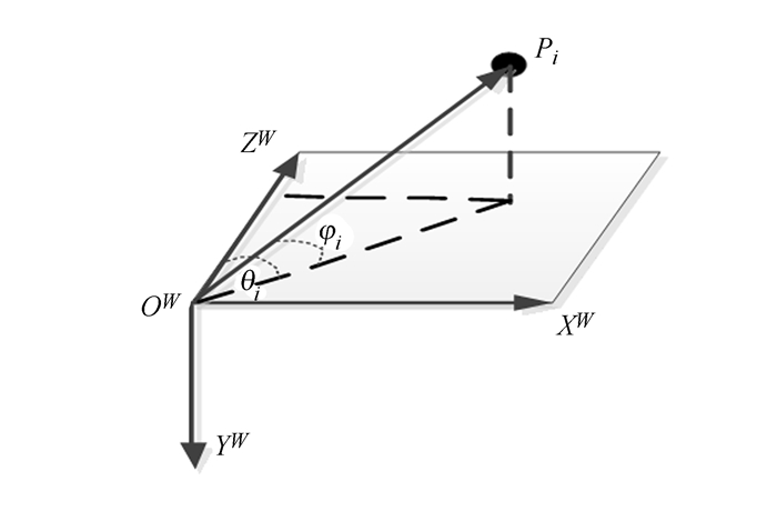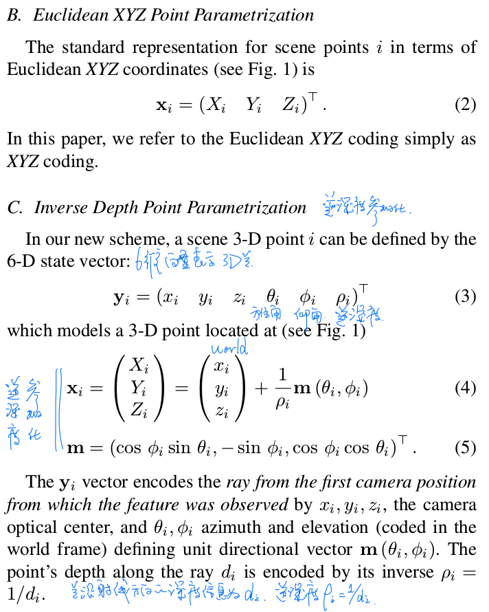 . 逆深度参数是一个六维变量,假设目标上第i个特征点的逆深度参数表示为: y i w = ( x i , y i , z i , θ i , ϕ i , ρ i ) T {y_i}^w=(x_i, y_i, z_i,\theta _i,\phi _i,{ \rho }_{ i })^T yiw=(xi,yi,zi,θi,ϕi,ρi)T ( x i , y i , z i ) T (x_i, y_i, z_i)^T (xi,yi,zi)T表示视觉相机在世界坐标系下的位置, θ i \theta _i θi与 ϕ i \phi _i ϕi分别表示目标特征 P i P_i Pi在世界坐标下,视觉相机光心与特征点连线相对于光轴方向的方位角和高低角。该点在欧氏空间中的表示向量为: x i w = ( X i , Y i , Z i ) T {x_i}^w=(X_i, Y_i, Z_i)^T xiw=(Xi,Yi,Zi)T