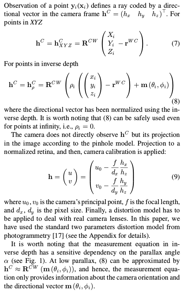 论文2对远点采用一种逆深度参数化的方式,并且得到经验性数据,一般不超过基线距40倍的深度可以被有效参数化,并用来计算相机旋转,位移和尺度;超过40倍baseline的为远点,可以提供旋转信息,但是位移和尺度信息比较弱,其需要在多个视图的支持下进行三角化。