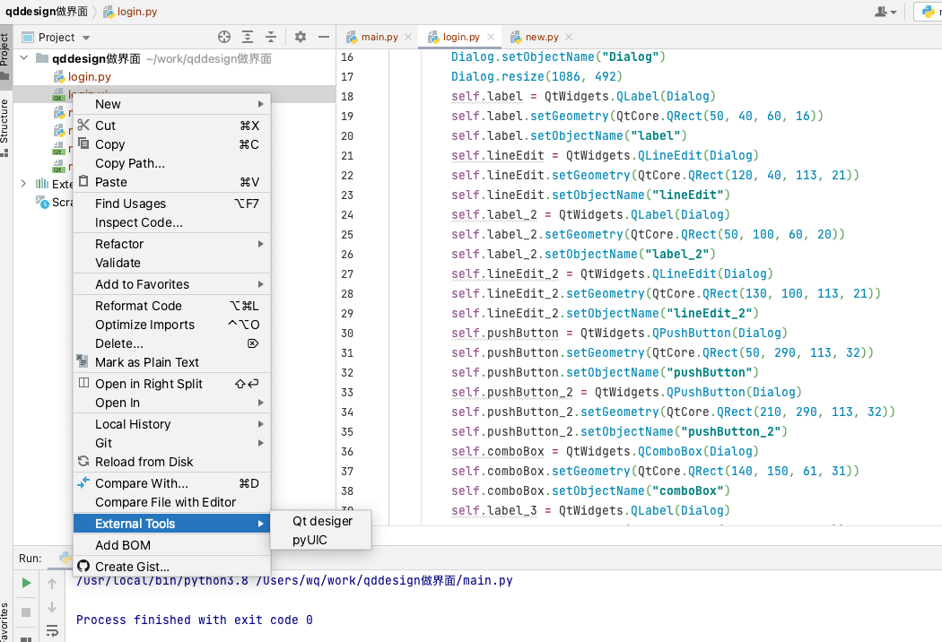 1.用Qt designer生成一个ui文件后放到pycharm的工程路径里面。选择外部工具pyUIC即可将ui文件转换为py文件进行开发