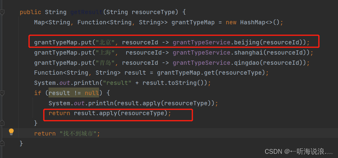 public String getResult(String resourceType) {Map> grantTypeMap = new HashMap<>();grantTypeMap.put("北京", resourceId -> grantTypeService.beijing(resourceId));grantTypeMap.put("上海", resourceId-> grantTypeService.shanghai(resourceId));grantTypeMap.put("青岛", resourceId -> grantTypeService.qingdao(resourceId));Function result = grantTypeMap.get(resourceType);System.out.println("result" + result.toString());if (result != null) {System.out.println(result.apply(resourceType));return result.apply(resourceType);}return "找不到地方";}