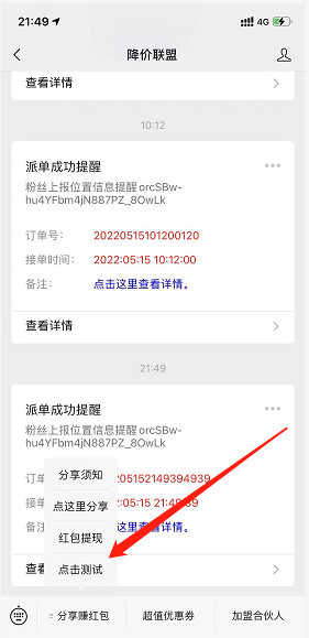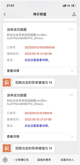 {//事件消息处理:点击菜单clickpublic class MenuClickEventDeal :System.Web.UI.Page{public string DealResult(string weixinXML){string content = DealMenuClick(weixinXML); return content;}public string DealMenuClick(string weixinXML){string strresponse = "";XmlDocument doc = new XmlDocument();doc.LoadXml(weixinXML);XmlNodeList list = doc.GetElementsByTagName("xml");XmlNode xn = list[0];string FromUserName = xn.SelectSingleNode("//FromUserName").InnerText; //关注用户的加密后openidstring ToUserName = xn.SelectSingleNode("//ToUserName").InnerText; //公众微信号原始IDstring MsgType=xn.SelectSingleNode("//MsgType").InnerText;string Event=xn.SelectSingleNode("//Event").InnerText;string EventKey=xn.SelectSingleNode("//EventKey").InnerText;//保存点击菜单click事件SaveEvent(FromUserName, ToUserName, EventKey);if(EventKey == "14"){//菜单自定义键值14的处理ReturnMsg rm = new ReturnMsg();strresponse = rm.ReturnText(FromUserName, ToUserName, "您刚点击的菜单键值为" + EventKey);}//给管理员发送粉丝点击菜单通知QinMing.WeixinTemplateMessage.SendTemplateMessage.SendRemindMsg("管理员openid", "粉丝点击菜单信息提醒" + FromUserName, "http://www.yourweb.com/OneUser.aspx?open_id=" + FromUserName); return strresponse;}//保存事件信息public void SaveEvent(string FromUserName, string ToUserName,string EventKey){SqlConnection conn = new SqlConnection(QinMingConfig.DatabaseConnStr);conn.Open();SqlCommand cmd = new SqlCommand();cmd.Connection = conn;cmd.CommandText = "insert into weixin_recv_event (msg_type,event_type,open_id,gh_id,recv_time,event_key) "+ "values ('event','CLICK','" + FromUserName + "','" + ToUserName + "',getdate(),'" + EventKey + "') ";//QinMingTools.WriteLog("sql语句:", cmd.CommandText);cmd.ExecuteScalar();if (conn.State == ConnectionState.Open){conn.Close();conn.Dispose();}}}