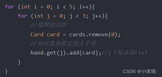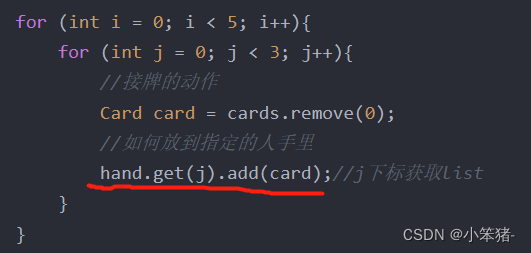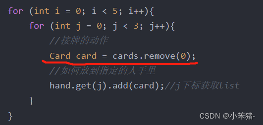 import java.util.Random;public class Test {//花色private static final String[] SUITS ={"♥","♠","♦","♦"};public static List buyCard(){List cards = new ArrayList<>();for (int i = 0; i < SUITS.length; i ++){for (int j = 1; j <= 13 ; j++){Card card = new Card(SUITS[i],j);cards.add(card);}}return cards;}//洗牌public static void shuffle( List cards){Random random = new Random();//生成随机数for (int i = cards.size()-1; i > 0; i--){int j = random.nextInt(i);//交换Card tmp = cards.get(i);cards.set(i,cards.get(j));//更新i下标的值cards.set(j,tmp);///更新j下标的值}}public static void main(String[] args) {List cards = buyCard();System.out.println(cards);System.out.println("洗牌:");shuffle(cards);System.out.println(cards);//3个人,每个人轮流接牌5张//每个人轮流接的牌都放到哪里List hand1 = new ArrayList<>();List hand2 = new ArrayList<>();List hand3 = new ArrayList<>();List> hand = new ArrayList<>();//二维数组hand.add(hand1);hand.add(hand2);hand.add(hand3);for (int i = 0; i < 5; i++){for (int j = 0; j < 3; j++){//接牌的动作Card card = cards.remove(0);//如何放到指定的人手里hand.get(j).add(card);//j下标获取list}}System.out.println("第一个人的牌:");System.out.println(hand1);System.out.println("第二个人的牌:");System.out.println(hand2);System.out.println("第三个人的牌:");System.out.println(hand3);System.out.println("剩下的牌:");System.out.println(cards);}