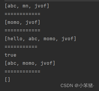 import java.util.List;public class test1 {public static void main(String[] args) {ArrayList arrayList = new ArrayList<>();arrayList.add("abc");arrayList.add("mn");arrayList.add("jvof");System.out.println(arrayList);System.out.println("============");List ret1 = arrayList.subList(1,3);ret1.set(0,"momo");System.out.println(ret1);System.out.println("============");List list = new ArrayList<>();list.add("hello");list.addAll(arrayList);System.out.println(list);System.out.println("===========");boolean ret = list.remove("hello");System.out.println(ret);System.out.println(list);System.out.println("============");list.clear();System.out.println(list);}