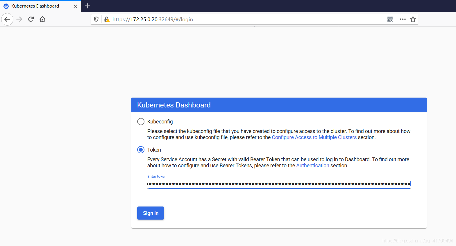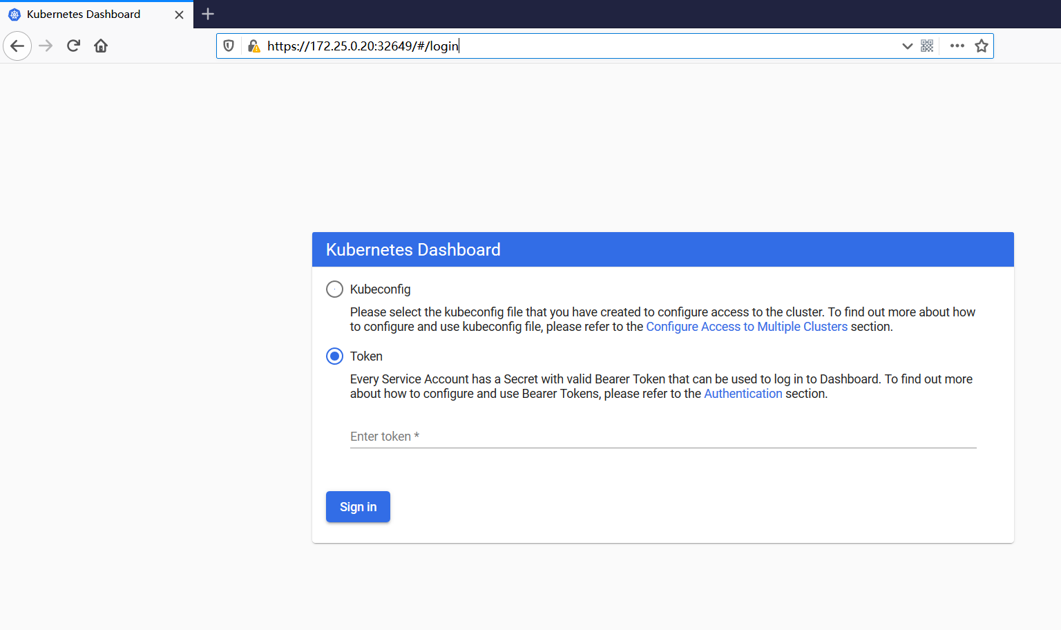 # kubectl create clusterrolebinding dashboard-cluster-admin --clusterrole=cluster-admin --serviceaccount=kubernetes-dashboard:dashboard-admin