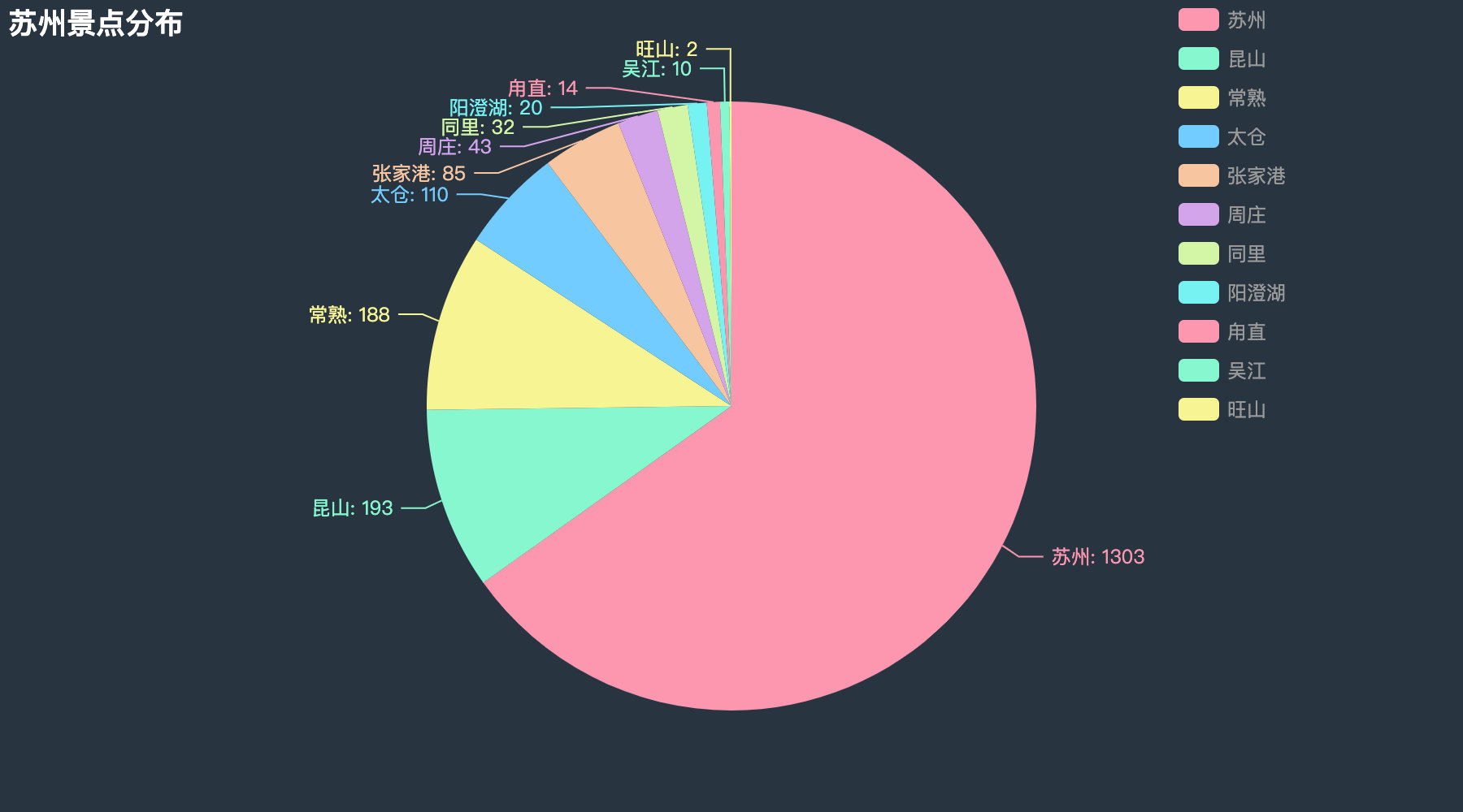 c = (Pie(init_opts=opts.InitOpts(theme=ThemeType.CHALK)).add("", [list(z) for z in zip(df2["location"].tolist(), df2["number"].tolist())]).set_global_opts(title_opts=opts.TitleOpts(title="苏州景点分布"),legend_opts=opts.LegendOpts(pos_left="80%", orient="vertical")).set_series_opts(label_opts=opts.LabelOpts(formatter="{b}: {c}"))