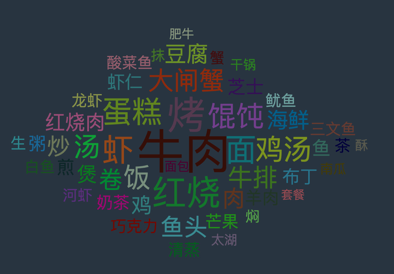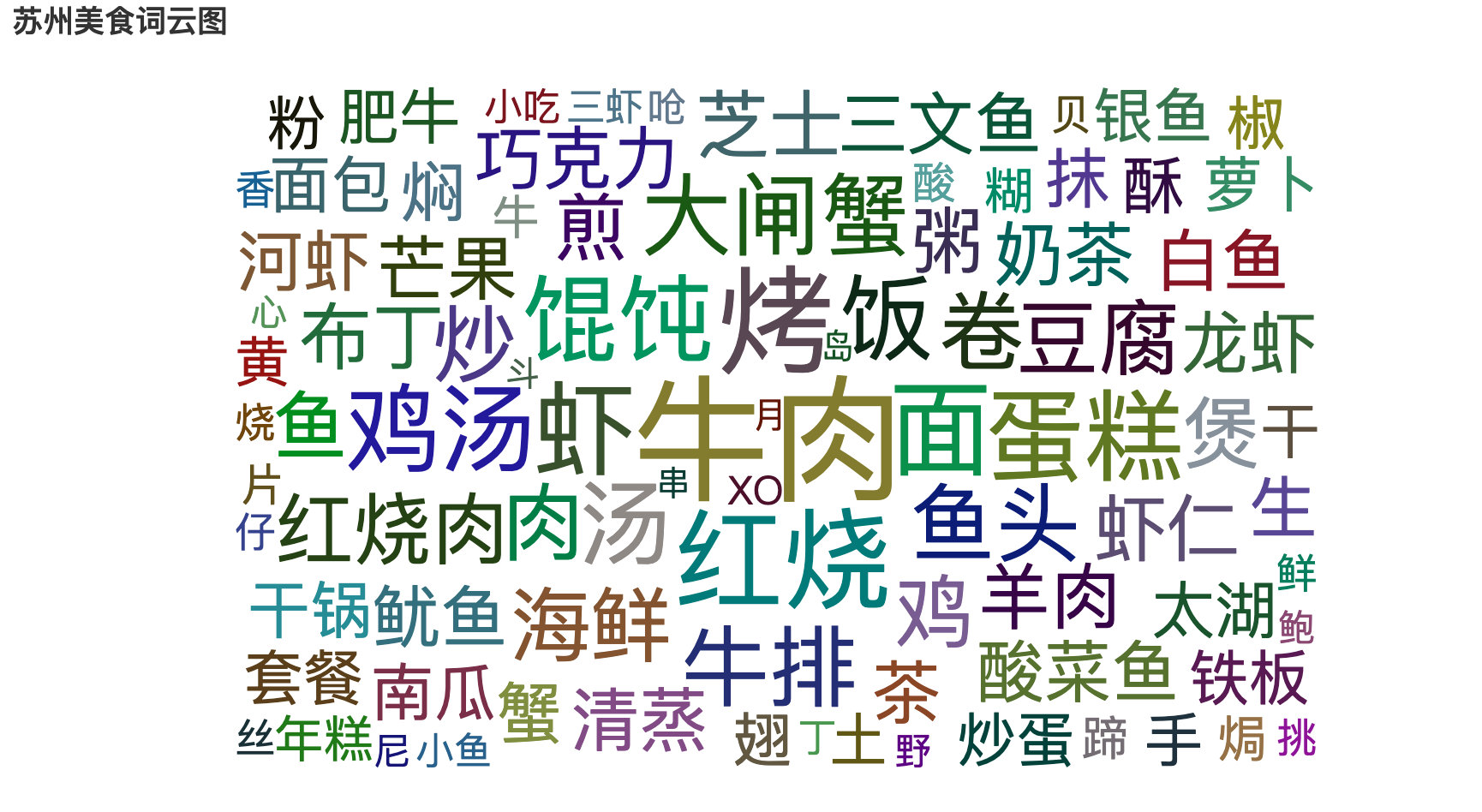 苏州的美食词云图主要是将数据的“推荐菜”这个字段进行词云图的展示,看看当地人爱好哪些美食。