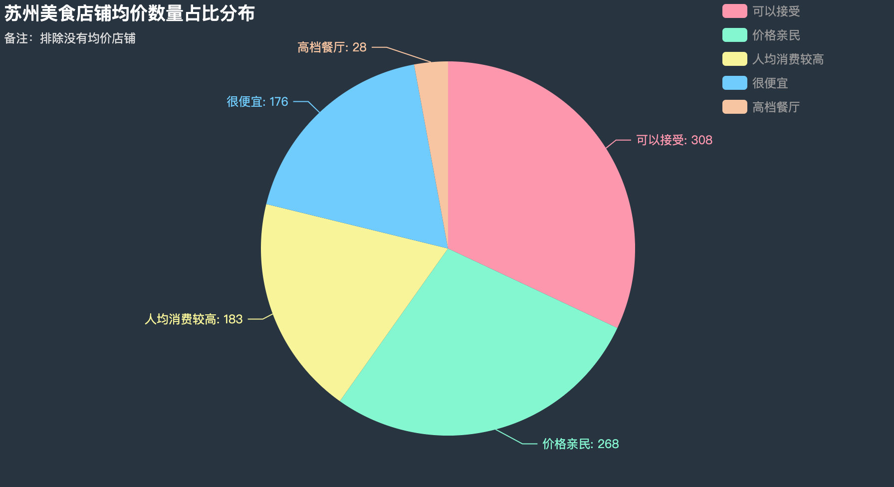 c = (Pie(init_opts=opts.InitOpts(theme=ThemeType.CHALK)).add("", [list(z) for z in zip(df5["分类"].tolist(), df5["数量"].tolist())]).set_global_opts(title_opts=opts.TitleOpts(title="苏州美食店铺均价数量占比分布",subtitle="备注:排除没有均价店铺"),legend_opts=opts.LegendOpts(pos_left="80%", orient="vertical")).set_series_opts(label_opts=opts.LabelOpts(formatter="{b}: {c}"))