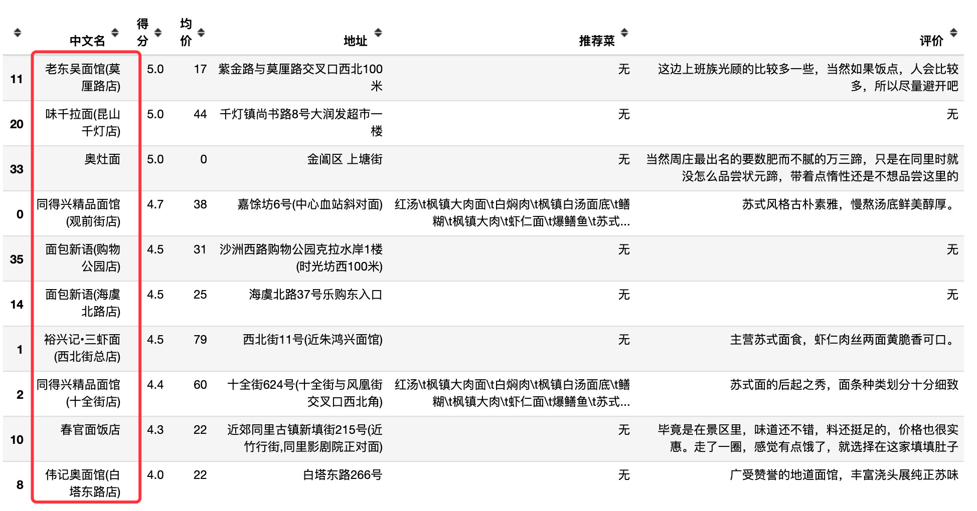 从上图中我们可以看到很多店是么有评分的。接下来,我们看看评分为5分的都是哪些店铺(取前10名)