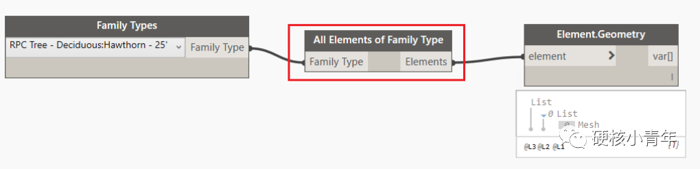接着是通过族来获取图元,我们调出 Family Types 节点,比如我们想找到关于某个特定族的所有图元,那么需要在节点中选择到这个族,然后使用 All Elements of Family Type 来获取结果,最后同样利用Element.Geometry节点得到几何形体。