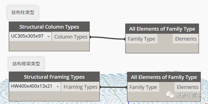 通过族类型来获取 Revit 的图元时,我们首先需要确认所要查找的图元的类别,比如以结构柱为例,要获取结构柱的某个族类型的所有图元,那就需要 Structural Column Types 这个节点,在他的下拉框中选择对应的族类型。然后仍然是使用 All Elements of Family Type 节点来获取相应的图元。