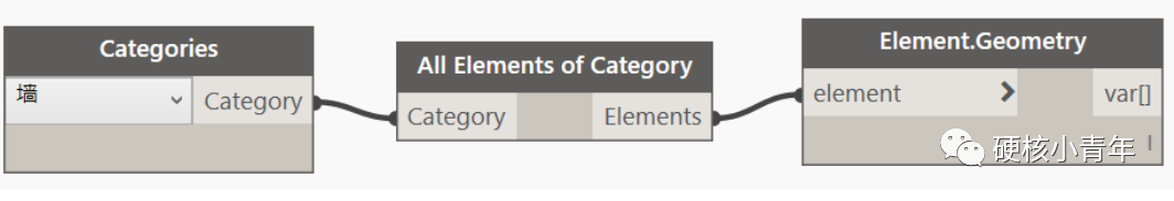我们找到 Categories 这个节点,比如我们想获取Revit 中所有的墙,那么我们就通过下拉框找到墙类别,然后通过 All Elements of Category 这个节点找到所有的墙图元,这些图元获取到之后我们需要使用 Element.Geometry节点将他们转化成可以在Dynamo中显示的几何形体并对其进行操作。