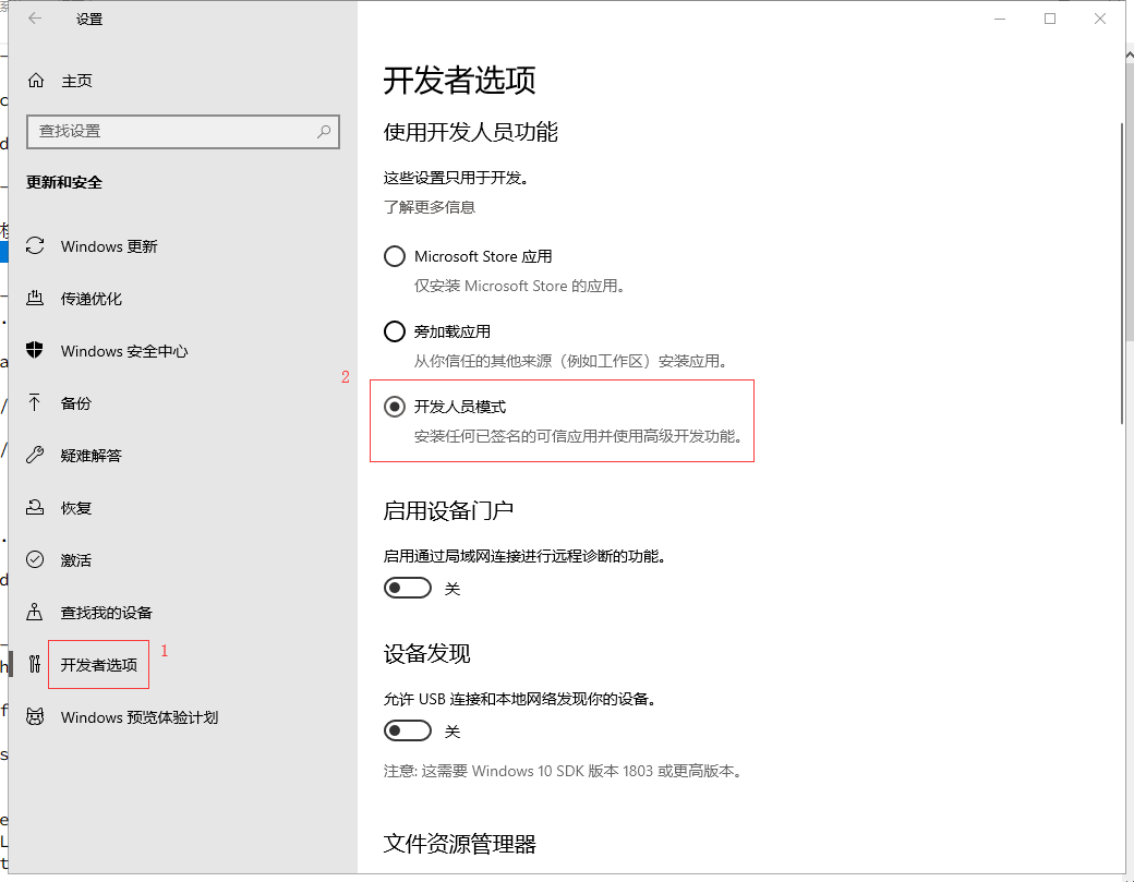 1 开发人员模式:windows 设置 -> 更新和安全 -> 开发者选项