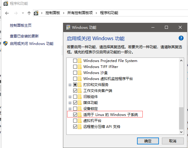 2 控制面板 -> 程序和功能 -> 启用或关闭Windows功能 -> 适用于Windows的Linux子系统一项 (勾选上)