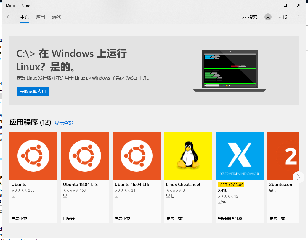 点选 Ubuntu 18.04 LTS 并安装。 本例已经安装过了。