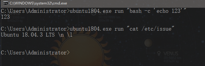 ubuntu1804.exe run "bash -c 'echo 123'"