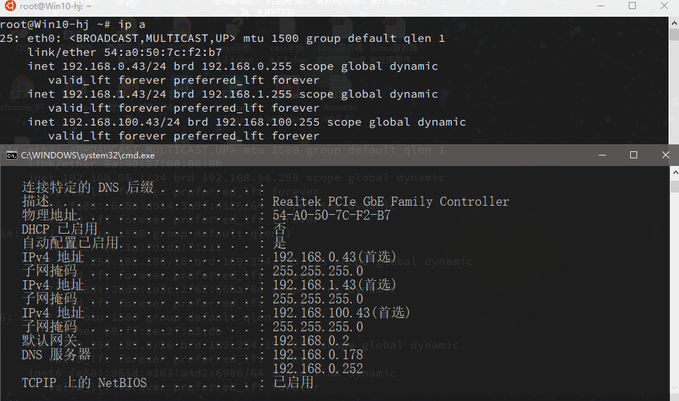 可以看到 家目录以 windows 主机名命名的。网络地址与本机一致 192.168.0.43, 192.168.1.43, 等。本机设置了多个IP地址。