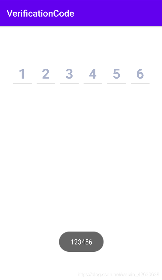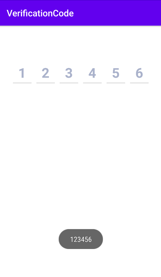 public class MainActivity extends AppCompatActivity {private VerifyCodeView verifyCodeView;@Overrideprotected void onCreate(Bundle savedInstanceState) {super.onCreate(savedInstanceState);setContentView(R.layout.activity_main);verifyCodeView = findViewById(R.id.verify_code_view);verifyCodeView.setInputCompleteListener(new VerifyCodeView.InputCompleteListener() {@Overridepublic void inputComplete() {Toast.makeText(MainActivity.this, ""+ verifyCodeView.getEditContent(), Toast.LENGTH_SHORT).show();}@Overridepublic void invalidContent() {}});}