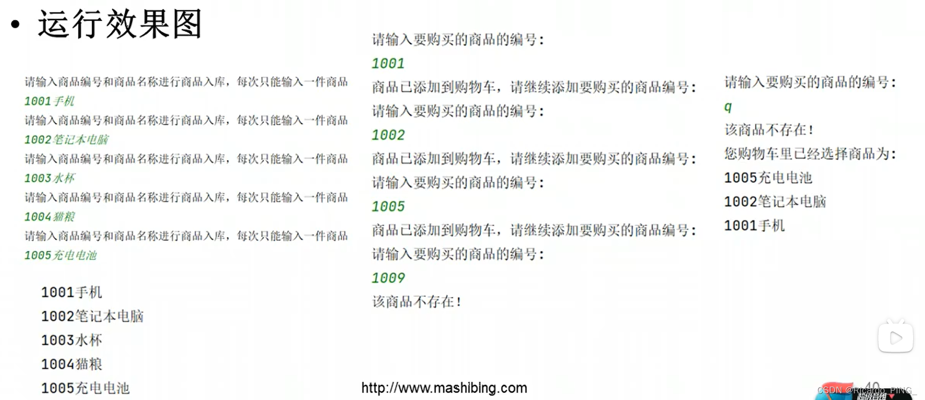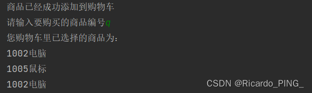 while True:flag = False # 代表没有商品的情况num = input("请输入要购买的商品编号")# 遍历商品列表,查询一下要买的商品是否存在for item in lst:if num == item[0:4]:flag = Truecart.append(item) # 添加到购物车列表print("商品已经成功添加到购物车")break # 退出的是for循环if not flag and num != "q": # not flag ==>flag == falseprint("该商品不存在")if num == "q":break # 退出的是while循环