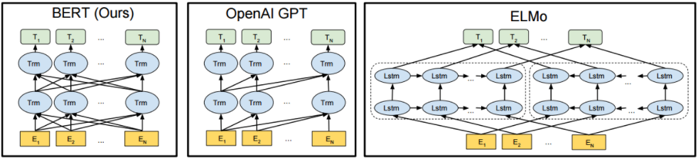 对比一下三种语言模型结构,BERT使用的是Transformer编码器,由于self-attention机制,所以模型上下层直接全部互相连接的。而OpenAI GPT使用的是Transformer解码器,它是一个需要从左到右的受限制的Transformer,而ELMo使用的是双向LSTM,虽然是双向的,但是也只是在两个单向的LSTM的最高层进行简单的拼接。所以作者们认为只有BERT是真正在模型所有层中是双向的。