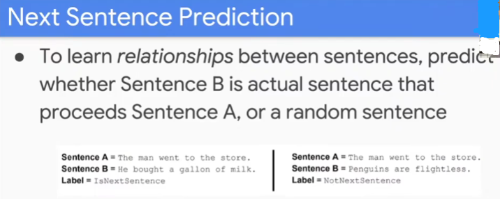 BERT为了让下游的问答(QA)和自然语言推理(NLI)任务能够进行,增加了另一个预训练任务,在 BERT 的训练过程中,模型将两个句子为一对作为输入,预测第二个句子是否在原始文档中是第一句的后续句子。