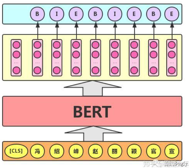 - 序列标注任务:该任务的实际应用场景包括:中文分词&新词发现(标注每个字是词的首字、中间字或末字)、答案抽取(答案的起止位置)等。对于该任务,BERT模型利用文本中每个字对应的输出向量对该字进行标注(分类),如下图所示(B、I、E分别表示一个词的第一个字、中间字和最后一个字)。
